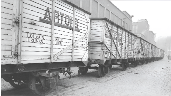 Mobilise ses collègues brasseurs pour la reconstruction de Louvain après les bombardements qui ont gravement endommagé la brasserie et les maisons des salariés.