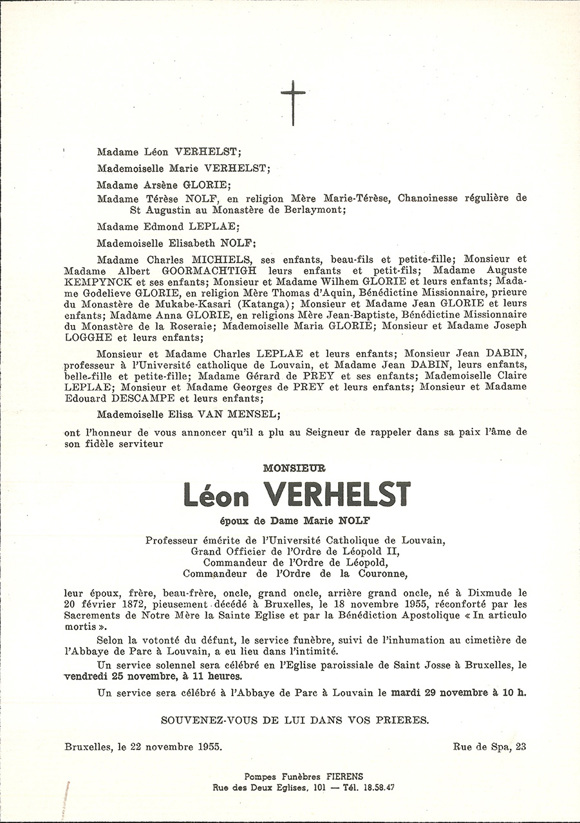 18 novembre : Léon Verhelst annule par téléphone le matin même sa participation à une réunion du conseil d'administration prévue le lendemain. Il ne se sent pas bien. Vers 15 heures, son épouse signale que son état empire. Léon Verhelst décède le jour même.